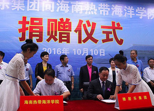 2016年,雅居樂向海南熱帶海洋學(xué)院捐贈(zèng)1億元人民幣,用于海南熱帶海洋學(xué)院的設(shè)施建設(shè)、科研事業(yè)、優(yōu)秀師生的獎(jiǎng)勵(lì)及貧困師生的救助,以全力推動(dòng)學(xué)校未來的發(fā)展。該筆捐款是海南教育史上單筆最高額的捐款。海南熱帶海洋學(xué)院黨委書記韋勇在致辭中表示,學(xué)校一定會(huì)好好利用這筆捐贈(zèng),加快學(xué)校的設(shè)施建設(shè),加大科研投資力度,幫助貧困師生,激勵(lì)優(yōu)秀學(xué)子,爭(zhēng)取將學(xué)校建設(shè)成為“立足海南,服務(wù)南海,面向國(guó)際”的綜合性、應(yīng)用型、有特色的國(guó)際化學(xué)府。