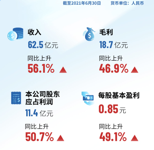 2021年上半年,集團(tuán)業(yè)績(jī)實(shí)現(xiàn)高質(zhì)量發(fā)展。公告顯示,集團(tuán)上半年?duì)I業(yè)額為人民幣62.47億元,較去年同期增長(zhǎng)56.1%;毛利18.73億元,同比增加46.9%,毛利率為30.0%;股東應(yīng)占利潤(rùn)為11.42億元,同比增加50.7%。每股基本盈利為0.85元。