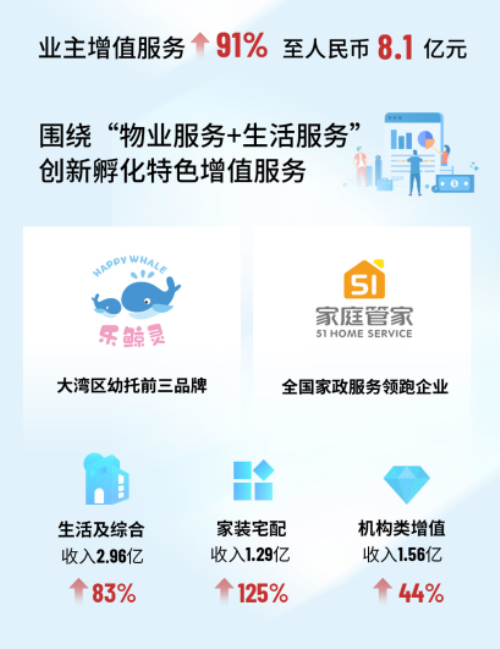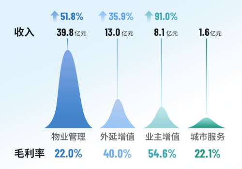 通過(guò)精細(xì)化運(yùn)營(yíng)及科技賦能,雅生活集團(tuán)運(yùn)營(yíng)效益穩(wěn)步提升,收入結(jié)構(gòu)進(jìn)一步優(yōu)化,核心業(yè)務(wù)占比提升至近八成,核心業(yè)務(wù)毛利占比超七成。其中,物業(yè)管理服務(wù)收入同比增長(zhǎng)51.8%至39.77億,外延增值服務(wù)收入同比增長(zhǎng)35.9%至13.03億元,業(yè)主增值服務(wù)收入同比增長(zhǎng)90.9%至8.07億元,城市服務(wù)收入達(dá)1.59億元。