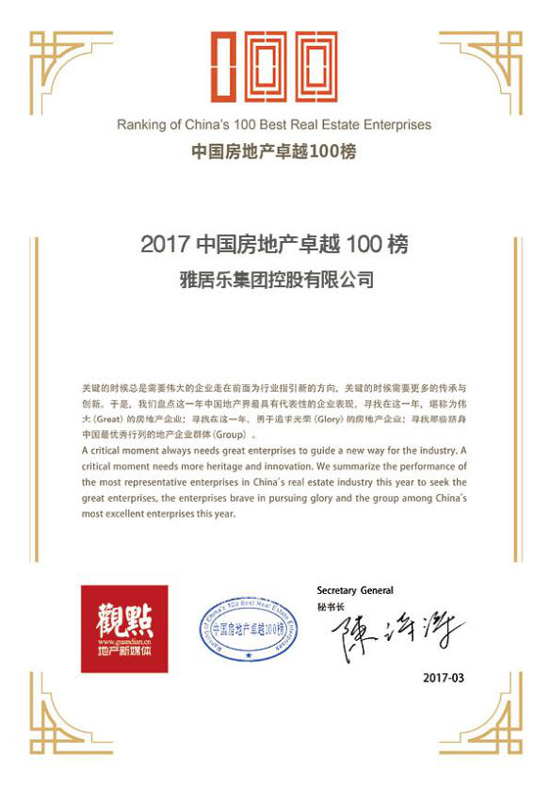 雅居樂榮獲“2017中國房地產(chǎn)卓越100榜”證書